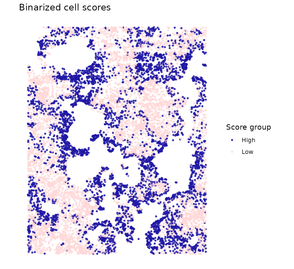 Binarizing at the median highlights the two spatial groups—high vs low scoring cells, revealing the organoid’s spatial compartments: